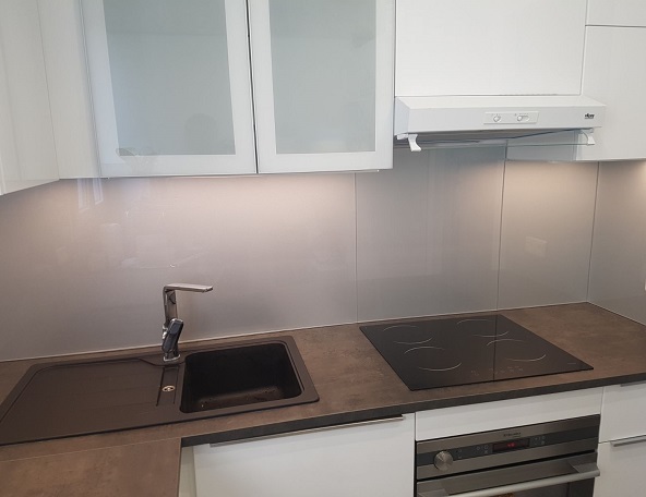 Dans le cadre de la rénovation de cet appartement parisien une crédence en verre laqué sécurisé a été installée dans la cuisine. C'est le verre laqué Aluminium Rich de la gamme Exclusives de Lacobel, un film de protection anti-éclats a été apposé sur la face laquée du verre qui est façonné Joint Plat Poli.