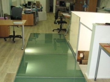 | I pavimenti e le scale in vetro permettono di ridurre il fabbisogno di illuminazione e ampliano lo spazio abitabile. Sono adoperati per diffondere la luce naturale o artificiale. I pavimenti e gradini in vetro, sempre realizzati in vetro stratificato Plastofloat, possono essere trasparenti, più o meno traslucidi oppure totalemente o parzialmente opachi secondo gli elementi, film e vetro, che sono stati scelti per la composizione. I vetri possono essere : Il vetro superiore puo' essere antisdrucciolo per limitare il rischio di scivolare sul vetro. |